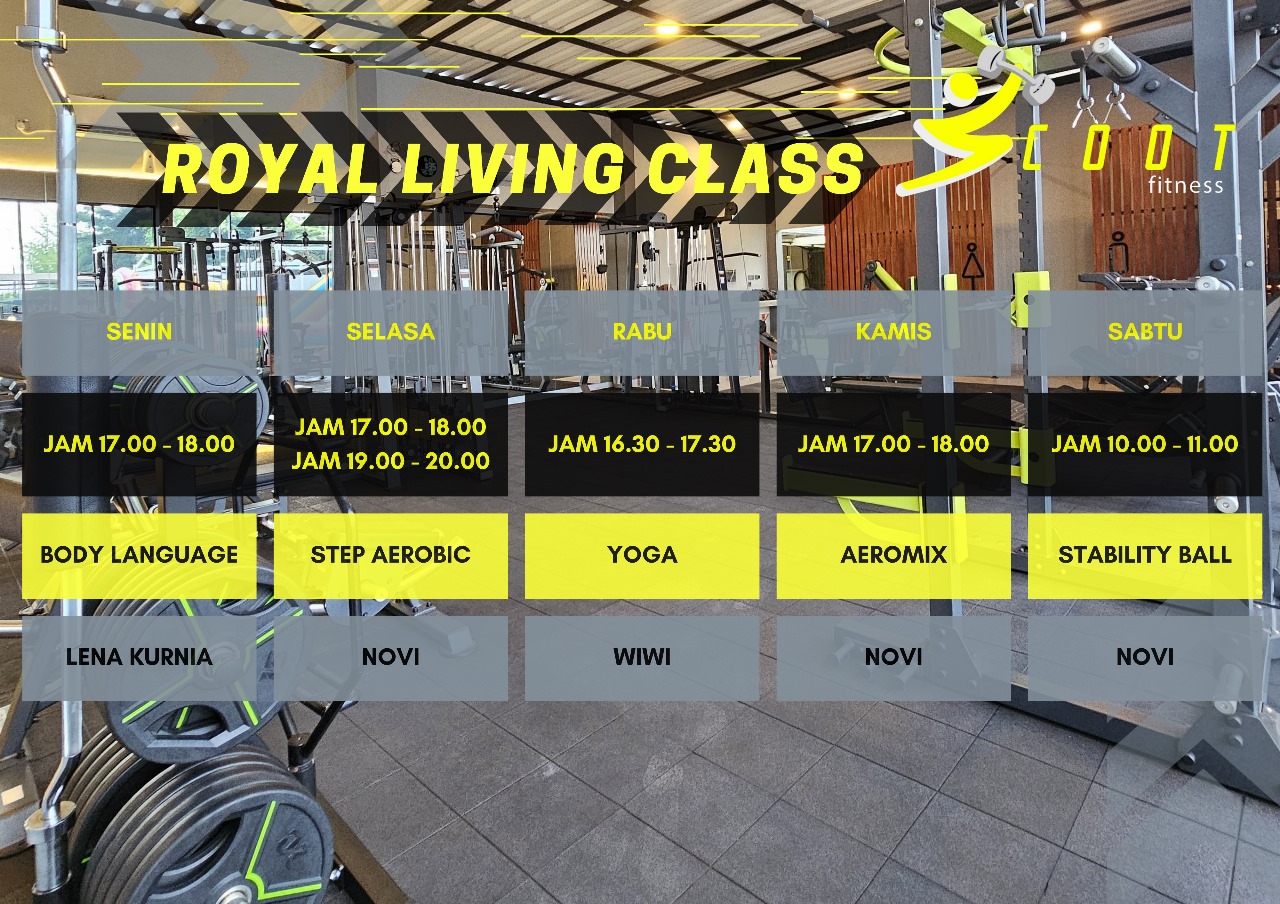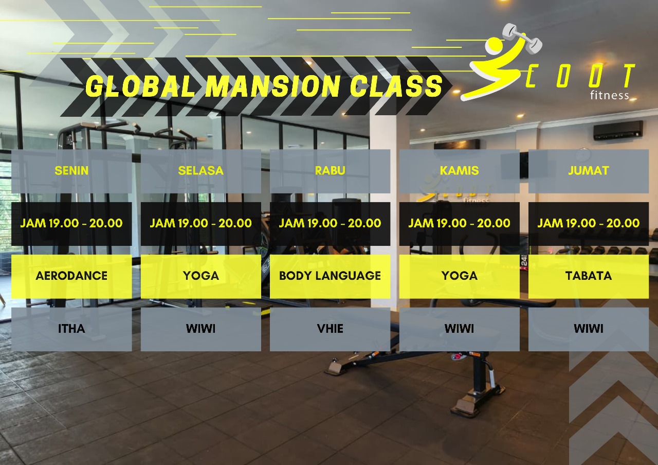 Jadwal Kelas Global Mansion Jam kelas Senin Selasa RABU kamis jumat 19:00 - 20:00 Aerodance yoga body language yoga tabata royal living Jam kelas Senin Selasa rabu kamis sabtu 10:00 - 11:00 Stability ball(Aerobik) 16:30 - 17:30 yoga 17:00 - 18:00 body language Step aerobic(Aerobik) Aeromix (aerobik) 19:00 - 20:00 Step aerobic(Aerobik) Download Schedule global mansion Royal Living follow SCOOT FITNESS INSTAGRAM